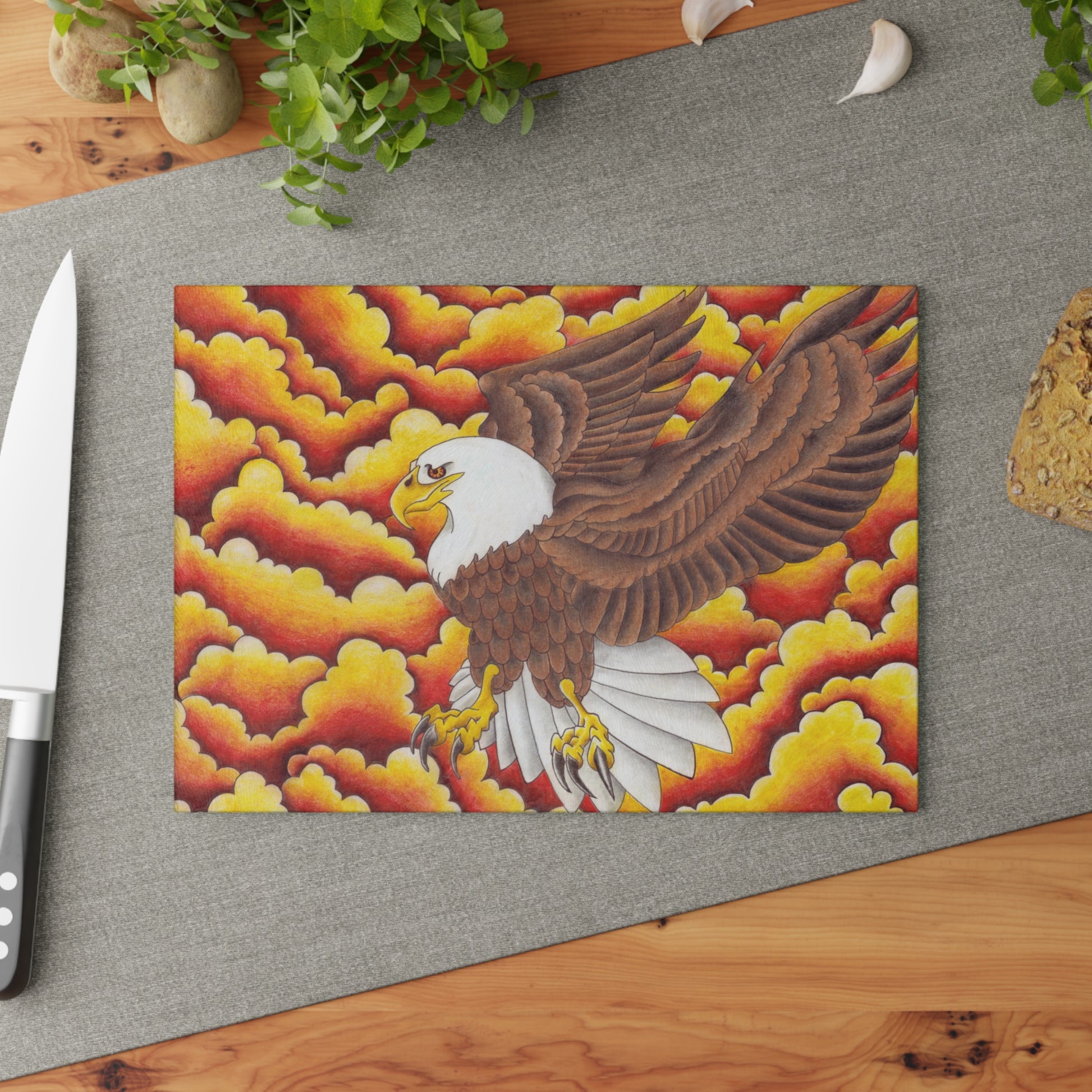 Eagle glass cutting board that adds a touch of nature and elegance to your kitchen. Perfect for nature lovers and those who appreciate unique home decor. Great for gifting during Thanksgiving, Christmas, or housewarmings.
